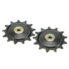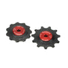 Precision machined Delrin® Derailleur pulleys featuring XD-15 Ceramic-Hybrid, radial bearings for enhanced shifting performance and longevity. Designed and manufactured for performance, these pulleys feature CN (tight clearance) bearings in the upper pulley to maximize shifting accuracy and C4 (loose clearance) bearings in the lower pulley to allow for chain-line movement.