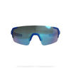 These sports glasses feature a sleek, frameless design with interchangeable polycarbonate lenses. The absence of a frame provides a lightweight and airy feel, while the full round lens shape offers excellent protection against sunlight, dust, and wind. The block system prevents damage to the lenses when folded inward, and the high-end Grilamid frame includes an adjustable rubber nose piece.